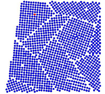 | In dieser simplen Darstellung wird nicht nur die Definition von "Kristall" ziemlich klar (obwohl die mathematische Durchdringung des Kristallkonzepts noch einigen Aufwand braucht), sondern wir kommen schon mit Defekten im Kristall in Berührung. Die Grenzen zwischen den einzelnen kristallinen Bereichen (den "Körnern" in Bild 1b), sind eindeutig Defekte im Kristall (sie heißen logischerweise "Korngrenzen"), denn hier stimmt der regelmäßige Aufbau nicht mehr - die Atome sind nicht mehr da, wo man sie bei einem perfekten Kristall erwartet hätte. Außerdem sind weitere Defekte eingezeichnet, z.B. fehlende oder "falsche" Atome. | ||