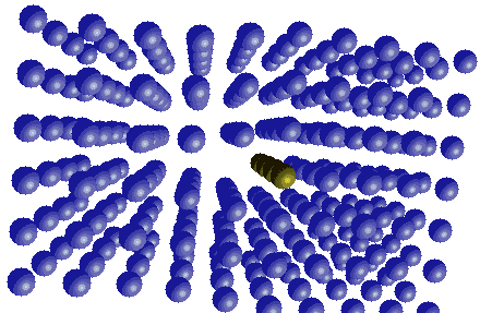 ![]() Bild 2 Perspektivische Darstellung der einfachsten Versetzung in einem einfachen Kristallgitter (Versetzungslinie durch andersfarbige Kugeln dargestellt) |