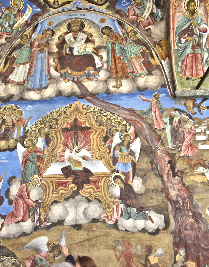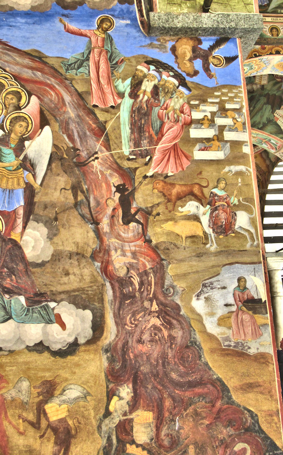 | A large wall paining found in the Riha monastery in Bulgaria reveals the nature of the brown river. It consists of stool (to use a friendly word that begins with an s) that emanates from the underside of the stool God is siting on. | ||||||||||