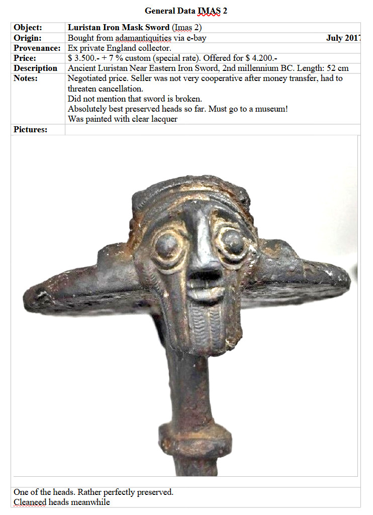 the lower part of the blade What can be seen is compatible with a layered structure. No X-ray picture was taken. n what follows I keep the format of the IMAS 1 file. What one finds upon close inspection is: The Blade The typical IMAS blade with a mid rip. Its length is identical to IMAS 1 but it is a tad wider at the lower half. The blade may have bee somewhat sharper than that of IMAS 1 but it is hard to tell due to corrosion. There are no wormholes. Corrosion Patterns The blade and the animals are more corroded that IMAS 1 but thee are no notable structures. Connection of Blade and Hilt Similar to IMAS 1 but less elaborate. The mid rip width stays constant but the blade shows more taper. There is no scalloped band.