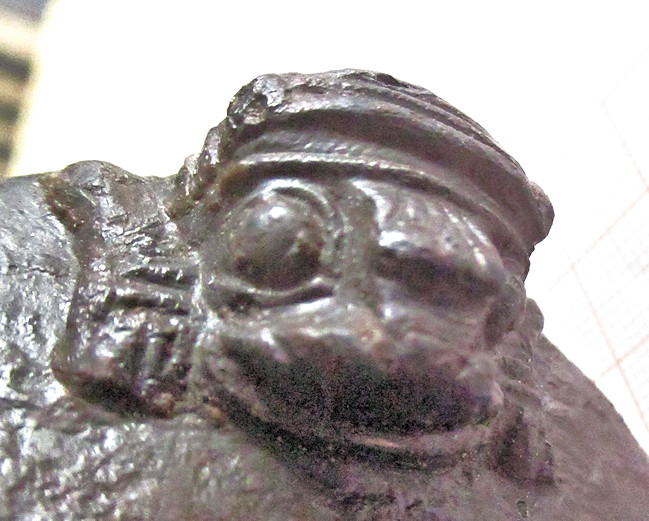 | The heads plus animal front part are well preserved. The pictures can not do justice to what one sees in a stereo microscope. There is a somewhat less abstract face compared to IMAS 1. The circular structures are definitely the eyes. The protrusions are not pronounced; the rather look look like ears. That is, of course, easier to carve than heads with pronounced protuberances. The front legs ending in paws are prominently rendered. |