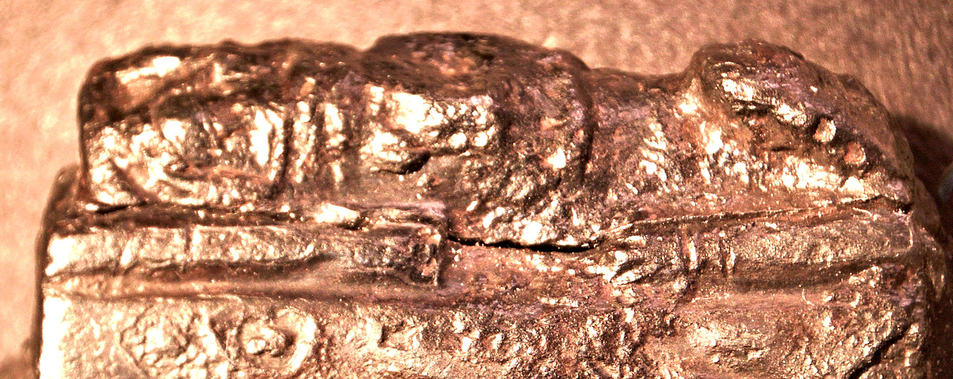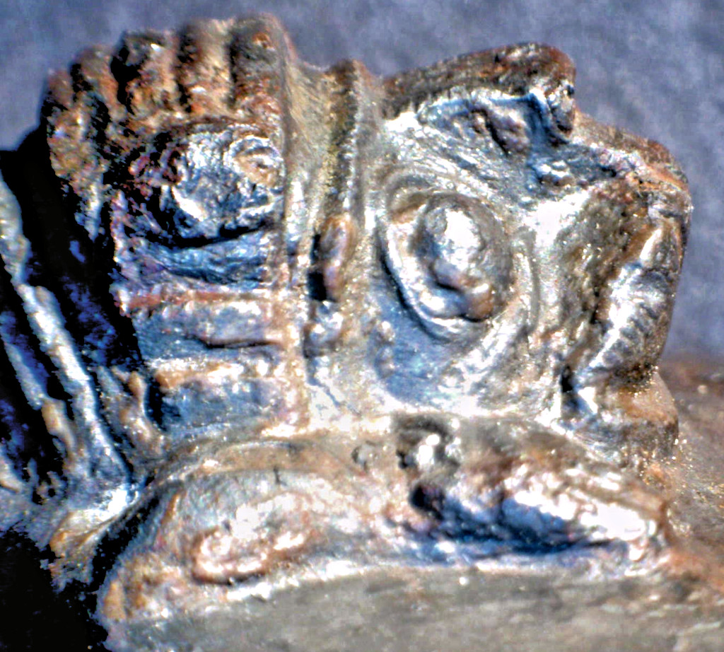 fixed, possibly followed by firing welding the rim. However. Upon close inspection, it appears that the un-corroded parts above are not just crimps but also the legs of the animal. This might indicate that the final carving was done after fixing the raw version of the animal to the heft and then carving the details. This makes some sense since fixing the whole contraption by fire welding including hammering, will damage the sculpture to some extent, especial at the legs on the far outside and right where the crimping takes place. It remains to be seen of this feature can also be found at other IMAS that started to come apart. Well, I had an epiphany about that. Use this link for details and go to the end of the module. | ||||