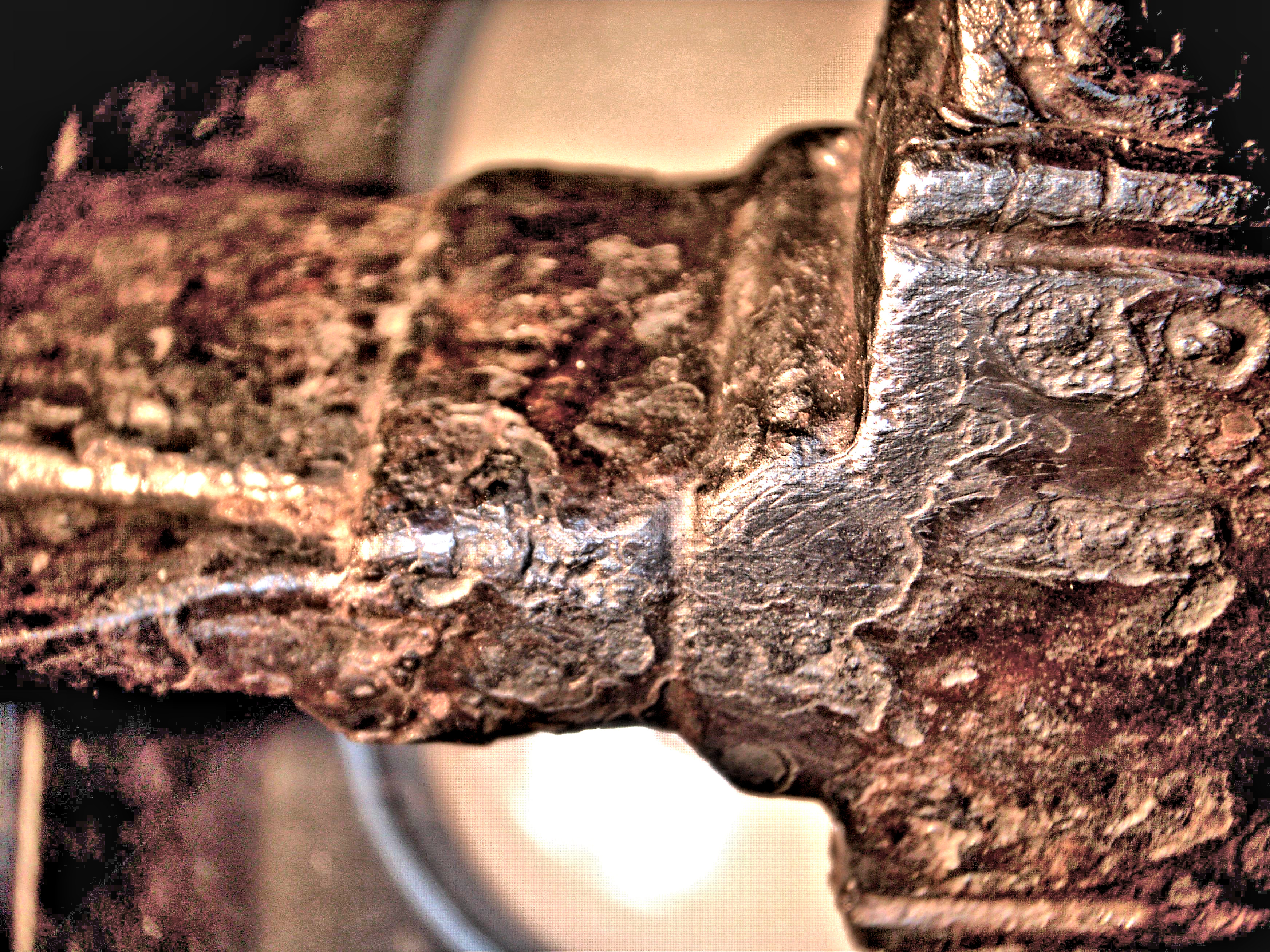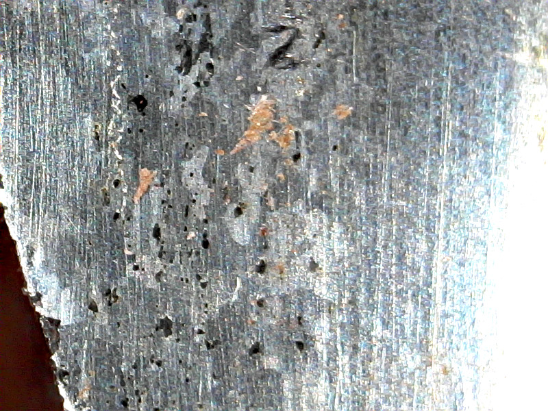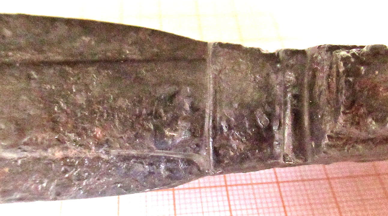 up small pits etc. (rather well done) Polished by hand the cross-section on the broken blade part. Did Nital etch. Definitely dirty old iron and possibly layered structure but not conclusive. Interesting enough for serious project |