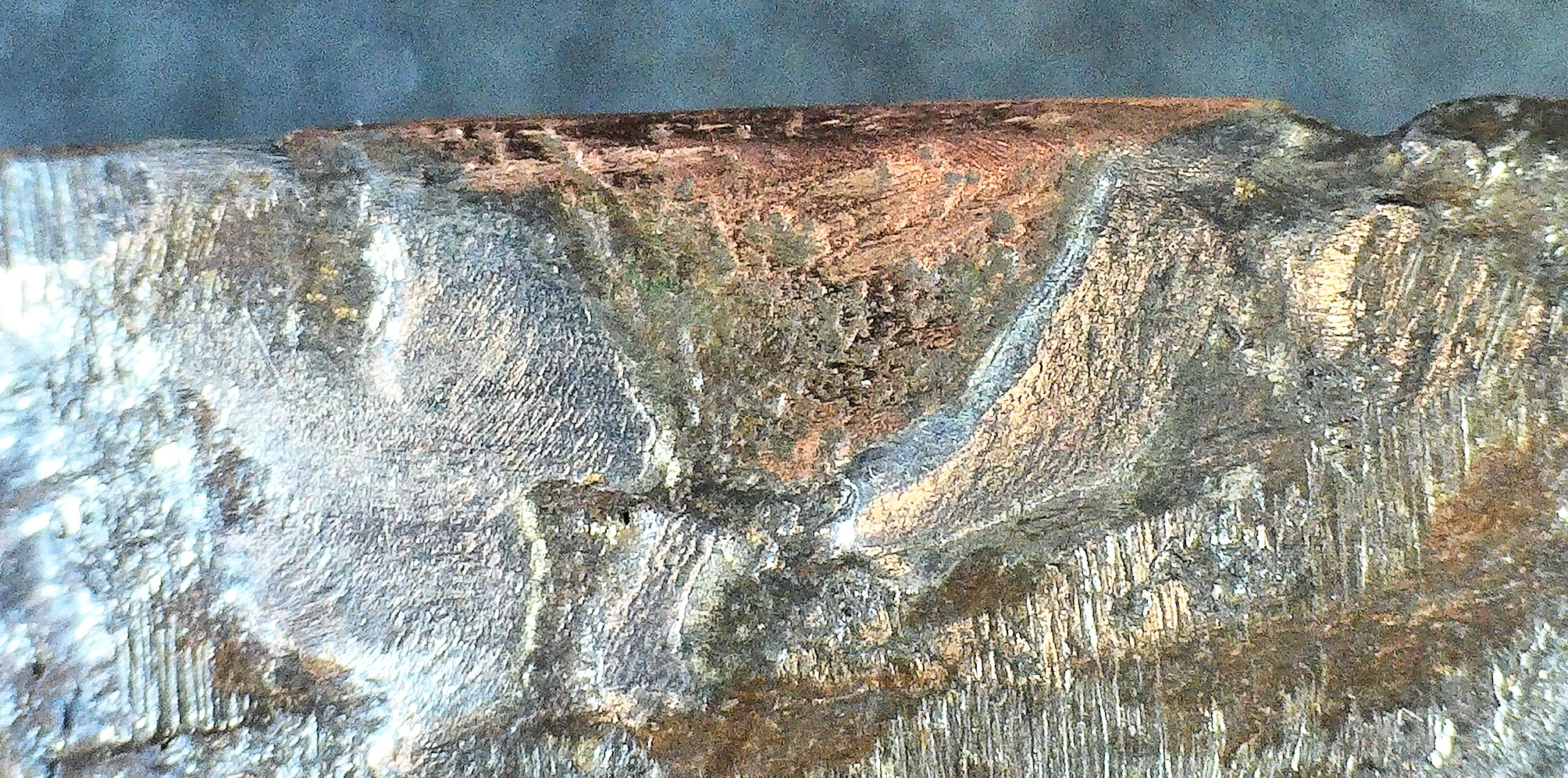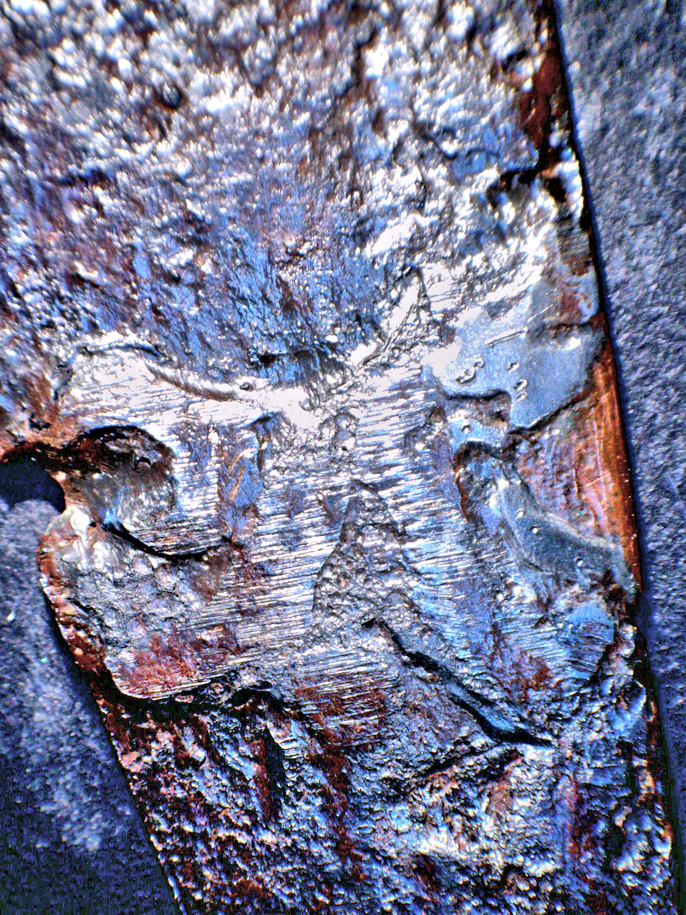 are due to corrosion taking place for almost 3000 years. The questions now is: Would the old Luri smiths have been capable of doing a repair like this? My answer is: yes! They certainly had noticed that tin has a low melting point and that you could melt it just by touching it with a medium hot copper rod. Moreover, the molten tin will wet the copper and coat the surface - provided the copper (or bronze) was clean. The hard part is to get liquid tin to wet iron. That needs a flux of some kind. While not any fatty substance (like bees wax) will work, some might. We just don't know those secrets anymore because we buy some working flux somewhere without having the faintest idea of what it contains.Wikipedia claims that olive oil and Ammonium chloride would work for soldering iron. Ammonium chloride, if you wonder, can be made from urine. If the old Luristanis had ammonium chloride is doubtful but they may have had similar substances and who knows what else might work Why did the use a piece of bronze and not a piece of iron to fill the holes? Who knows, My guess is that it is just much easier to work with. It it was completely covered with tin, it looks like like iron and you hardly could see the repaired part of the blade. | ||||
