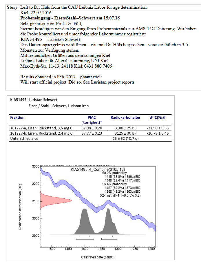 | IMAS 9 was one of the three swords that we for a C14 age analysis. The link tells you how that works. A small piece was cut off, its structure determined by metallurgy, and then used for the C14 analysis. The age found (see above) was 1427 – 1303 BC That, to all of our knowledge, is far too old. What happened? Easy to see. The C14 age determination gives the age of the carbon found inside the iron. If that carbon originated form the charcoal used for smelting the iron, its age qwould be sufficientlyx close to the age of the iron / sword. | ||||