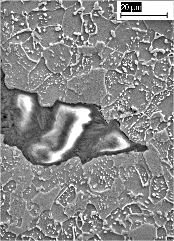 Schwert IR3743 Bezeichnung Antrag: Luri 2; Altersbestimmung: C-Konzentration C14 Probe: 0.38 % C14 Alter: 1427 – 1303 calBCE Metallographie: Poliert, Nital und Oberhoffer geätzt Ca. 220 Bilder im Lichtmikroskop Ca. 50 Bilder im REM, inkl. div. EDX Analysen. T ypisches Rennofeneisen, inhomogene Struktur und C-Verteilung (Fig. 2); Globularer Zementit, keine Härtung, Verformung durch (Kalt?) Schmieden. Keine Hinweise auf Feuerschweißen. Erhebliche Schlackeneinschlüsse (Fig. 3). Merklicher Ca Gehalt bei niedrigem K-Gehalt (Verhüttung mit Kalk?). Härte zwischen 100 und 200 mHV. | |||